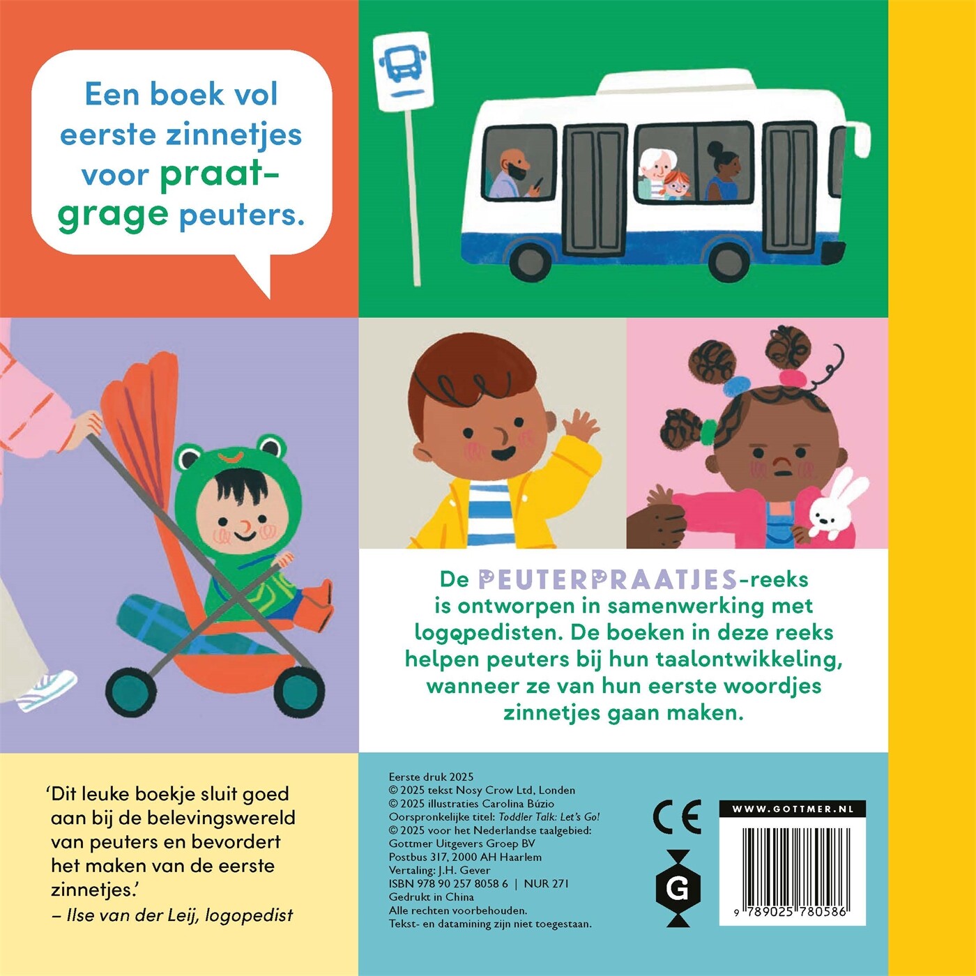 ‘Peuterpraatjes – Daar gaan we!’ is een kartonboekje speciaal ontworpen voor peuters om ze te helpen bij het leren van hun eerste zinnetjes. De kindjes in het boek maken een uitstapje naar het park. De eenvoudige en herkenbare zinnetjes over routines voor kleine kinderen – zoals ‘Naar buiten!’, ‘Met de bus.’, en ‘Laarsjes aan.’ – maken taalontwikkeling leuk en laagdrempelig. Door de herhaling van uitspraken, zoals ‘We zijn er bijna.’, ‘Goed vasthouden.’, ‘Hapje eten.’ en ‘Handjes schoon?’ kunnen kleintjes actief meedoen en nieuwe woorden leren gebruiken in korte zinnen.