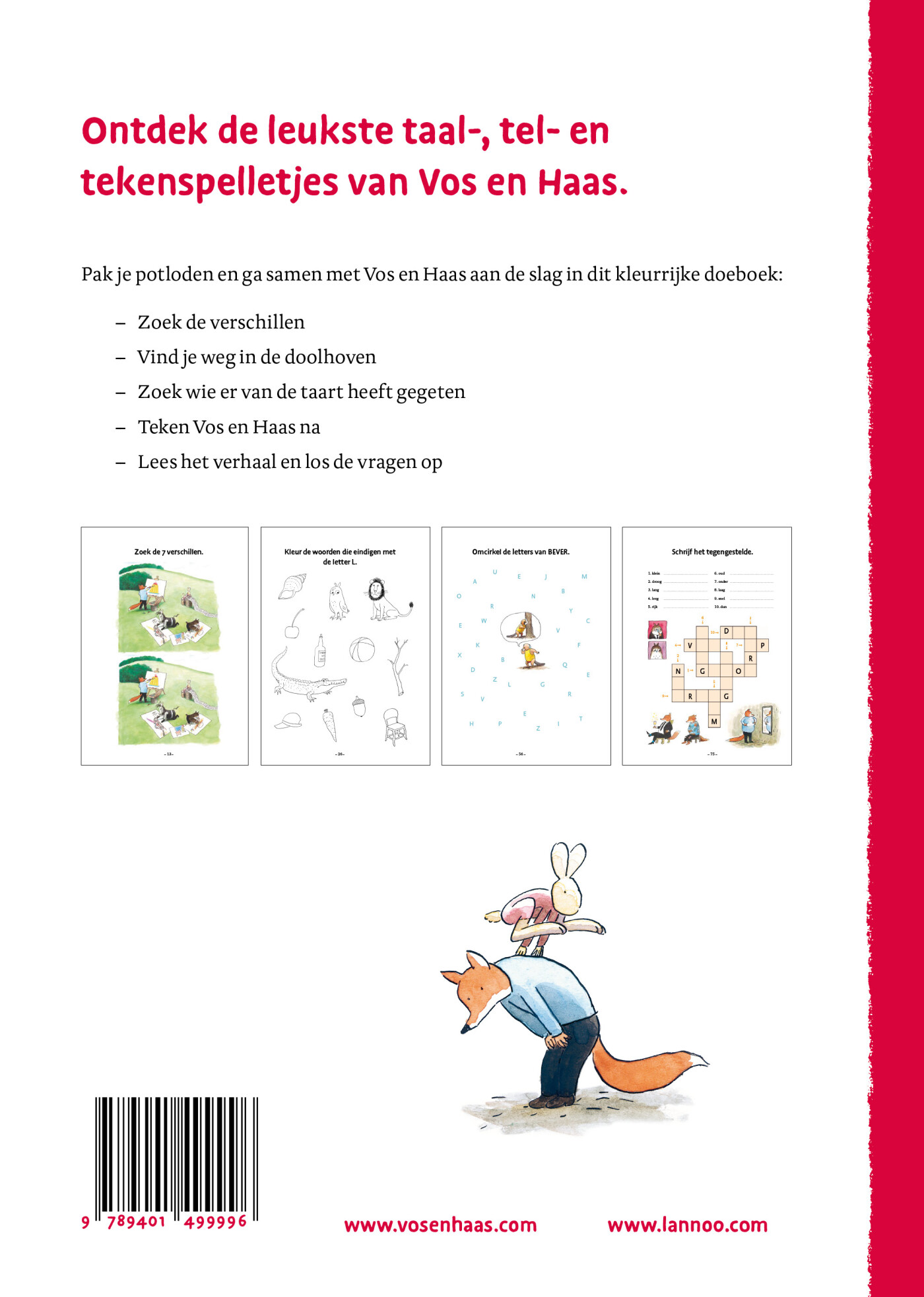 De lees- en schrijfspelletjes worden afgewisseld met creatieve tekenopdrachten, mooie illustraties en de herkenbare Vos en Haas-vrolijkheid.