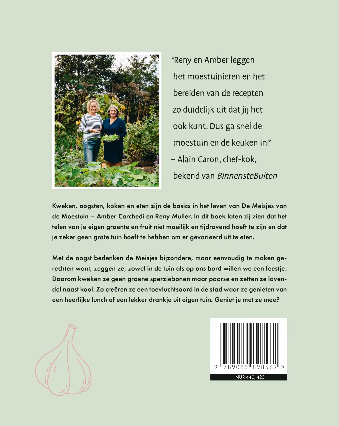 Kweken, oogsten, koken en eten zijn de basics in het leven van De Meisjes van de Moestuin – Amber Carchedi en Reny Muller. In dit boek laten zij zien dat het telen van je eigen groente en fruit niet moeilijk en tijdrovend hoeft te zijn en dat je zeker geen grote tuin hoeft te hebben om er gevarieerd uit te eten.