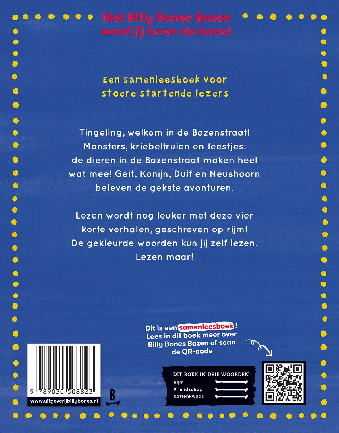 In vier korte verhalen, volledig geschreven op rijm, maak je kennis met de grappige, eigenwijze en soms wat bokkige dieren uit de gezelligste straat die bestaat. Extra leuk: de makkelijk te lezen woorden hebben een afwijkend lettertype, zodat die gelezen kunnen worden door het kind. Zo kunnen ouder en kind het boek echt samen lezen: leesplezier gegarandeerd!