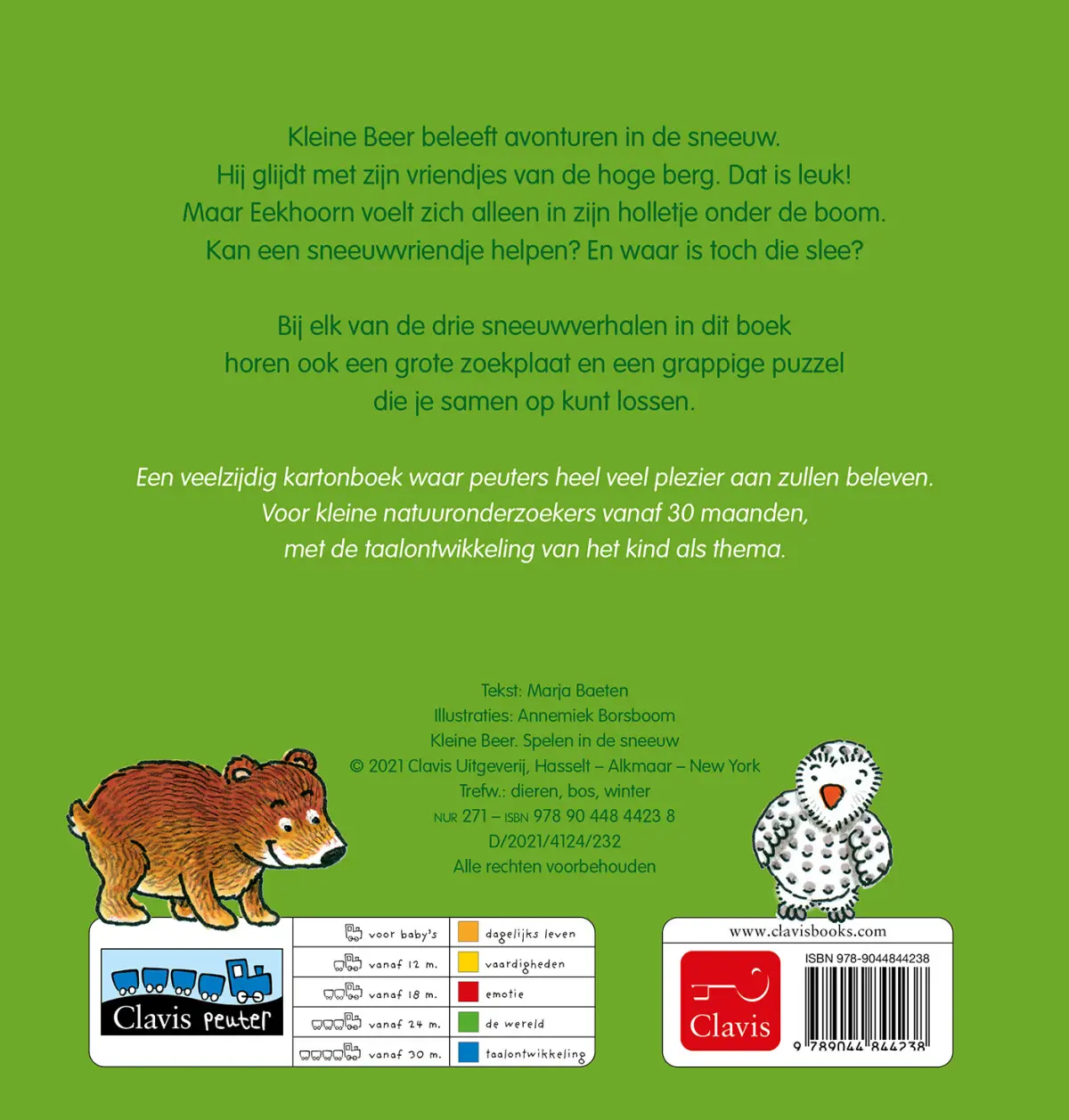 Kleine Beer beleeft avonturen in de sneeuw. Hij glijdt met zijn vriendjes van de hoge berg. Dat is leuk! Maar Eekhoorn voelt zich alleen in zijn holletjes onder de boom. Kan een sneeuwvriendje helpen? En waar is toch die slee?