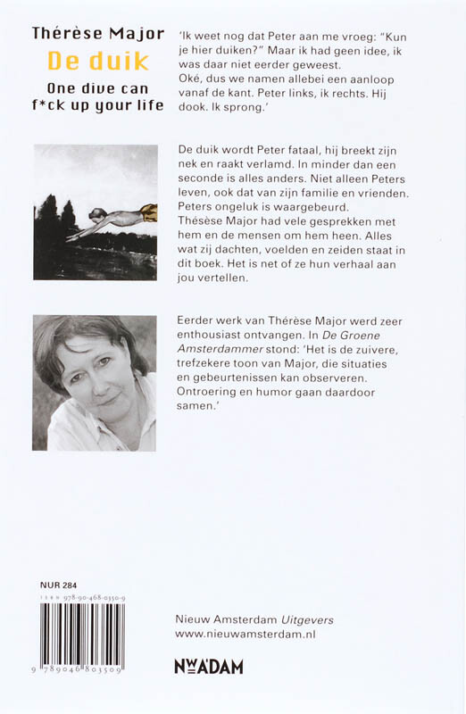 Th r se Major laat in _De duik_ zien wat er met Peter gebeurt na die fatale duik waarbij hij zijn nek breekt en verlamd raakt. In een split second verandert alles totaal. Niet alleen Peters leven, ook dat van zijn moeder, zijn vader, zijn broers en zus. Peters ongeluk is waargebeurd. Th r se Major had vele gesprekken met hem, zijn familie en zijn vrienden. Alles wat zij dachten, voelden en zeiden staat in dit boek. Het is net of ze hun verhaal aan jou vertellen. Levensechter kan niet. Het resultaat is een indrukwekkend eerlijk en oprecht boek. Ondanks het verschrikkelijke ongeluk is het geen somber verhaal, sterker nog: het is een pleidooi voor het leven. Maar natuurlijk is het tegelijkertijd een waarschuwing voor iedereen om nooit, maar dan ook nooit in onbekend water te duiken.