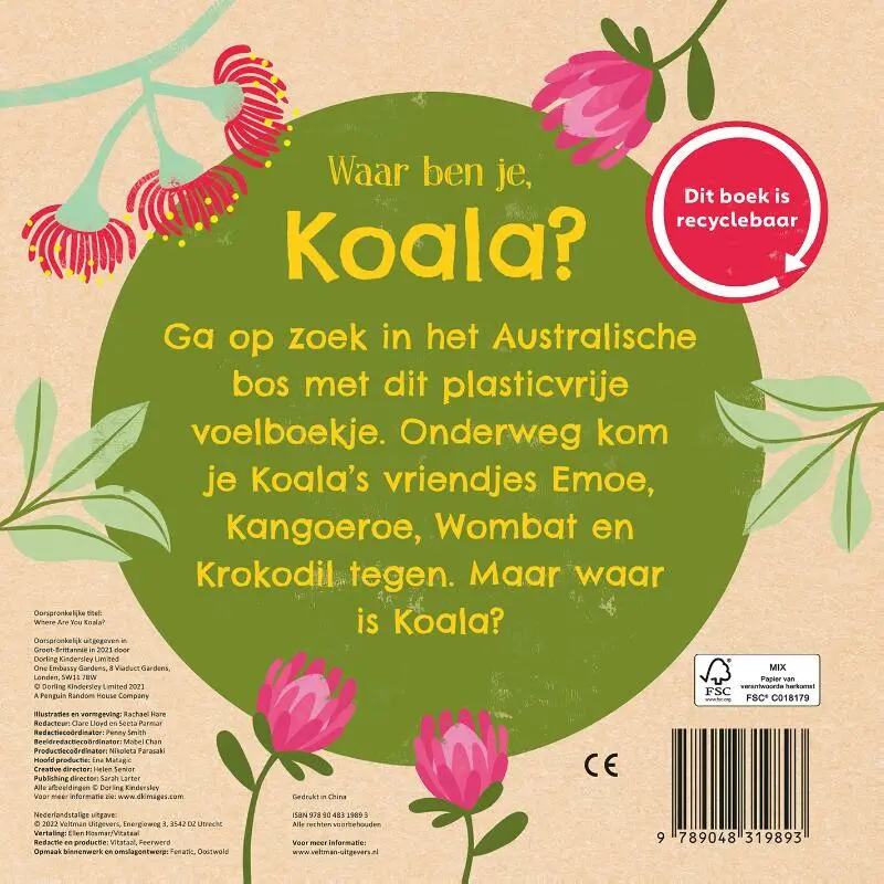 Waar ben je, Koala? Ga op zoek in het Australische bos met dit plasticvrije voelboekje. Onderweg kom je Koala’s vriendjes Emoe, Kangoeroe, Wombat en Krokodil tegen. Maar waar is Koala?