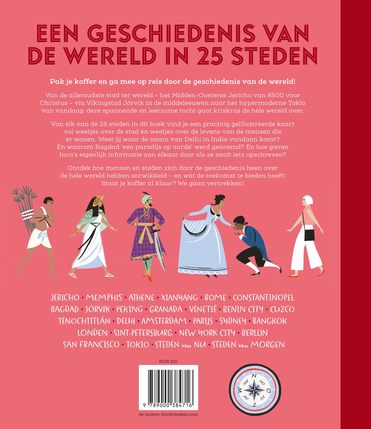Riemen vast, we gaan op reis door de geschiedenis! Van het oude Jericho in 8500 voor Christus via Vikingstad Jorvik in de middeleeuwen naar het hypermoderne Tokio van vandaag. De tocht gaat van oost naar west, van noord naar zuid, en over alle continenten heen. Van elke stad zijn een rijk geillustreerde kaart en heel veel informatie over het leven daar opgenomen.
