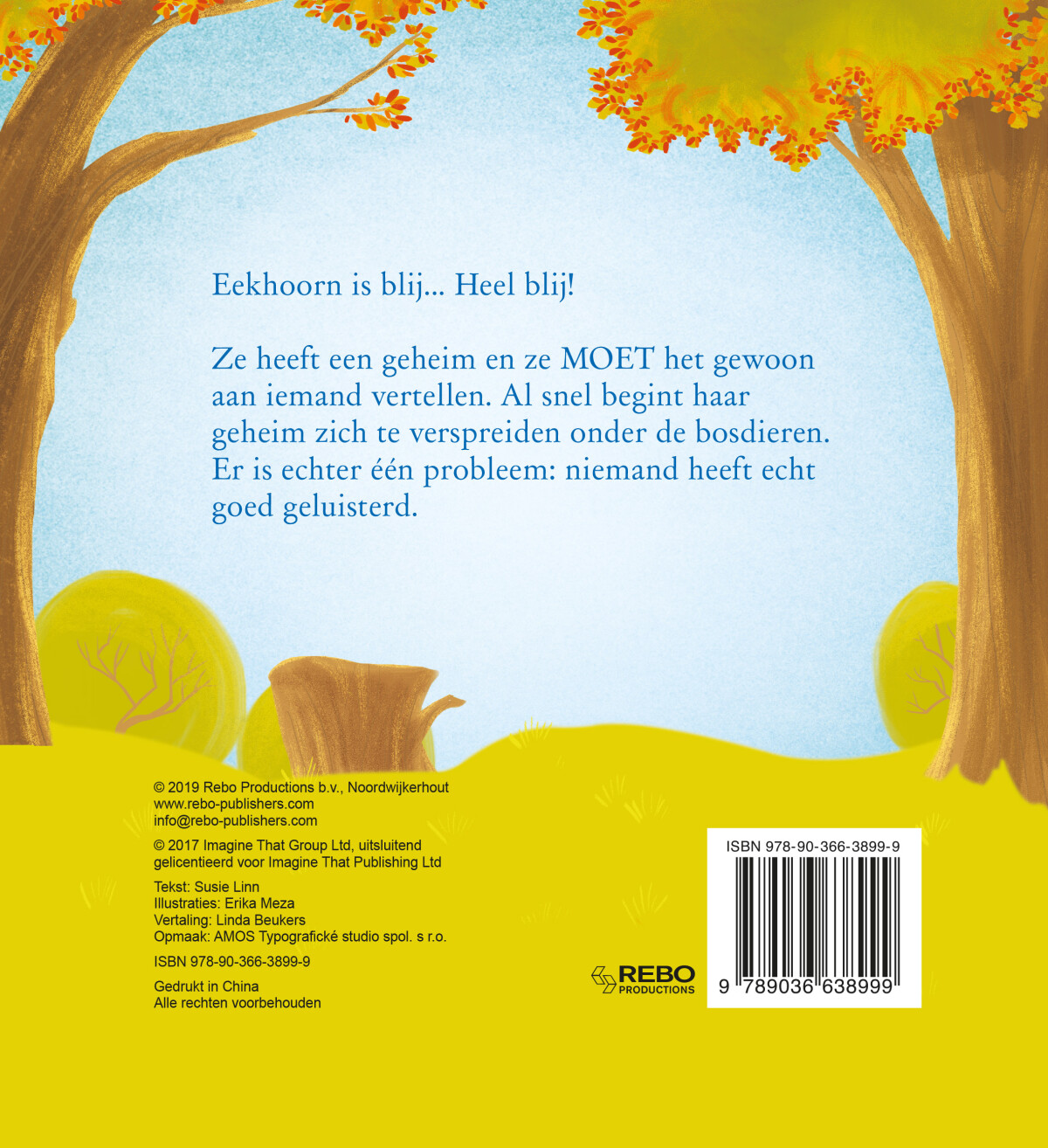 Eekhoorn is blij… Heel blij! Ze heeft een geheim en zo MOET het gewoon aan iemand vertellen. Al snel begint haar geheim zich te verspreiden onder de bosdieren. Er is echter één probleem: niemand heeft echt goed geluisterd.