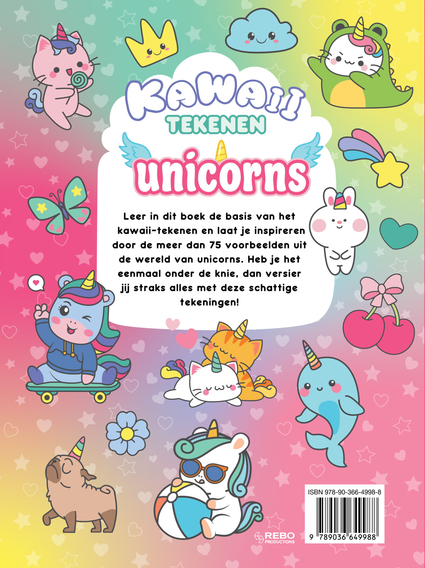 Vrolijk tekenboek dat stap-voor-stap uitlegt hoe je in kawaii-stijl schattige unicorns en andere magische wezens kunt tekenen.