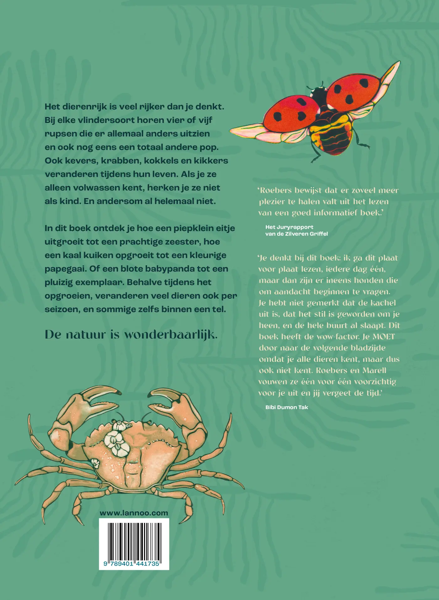 Het dierenrijk is veel rijker dan je denkt. Bij elke vlindersoort horen vier of vijf rupsen die er allemaal anders uitzien en ook nog eens een totaal andere pop. Ook kevers, krabben, kokkels en kikkers veranderen tijdens hun leven. Als je ze alleen volwassen kent, herken je ze niet als kind. En andersom al helemaal niet.
