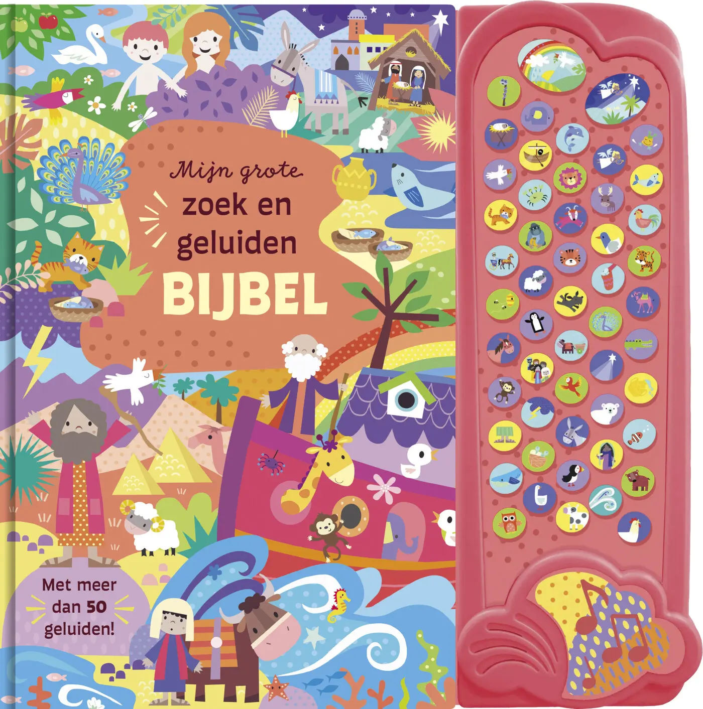Zoek de mensen, dieren en dingen in elk bijbelverhaal en luister naar meer dan 50 bijbehorende geluiden.