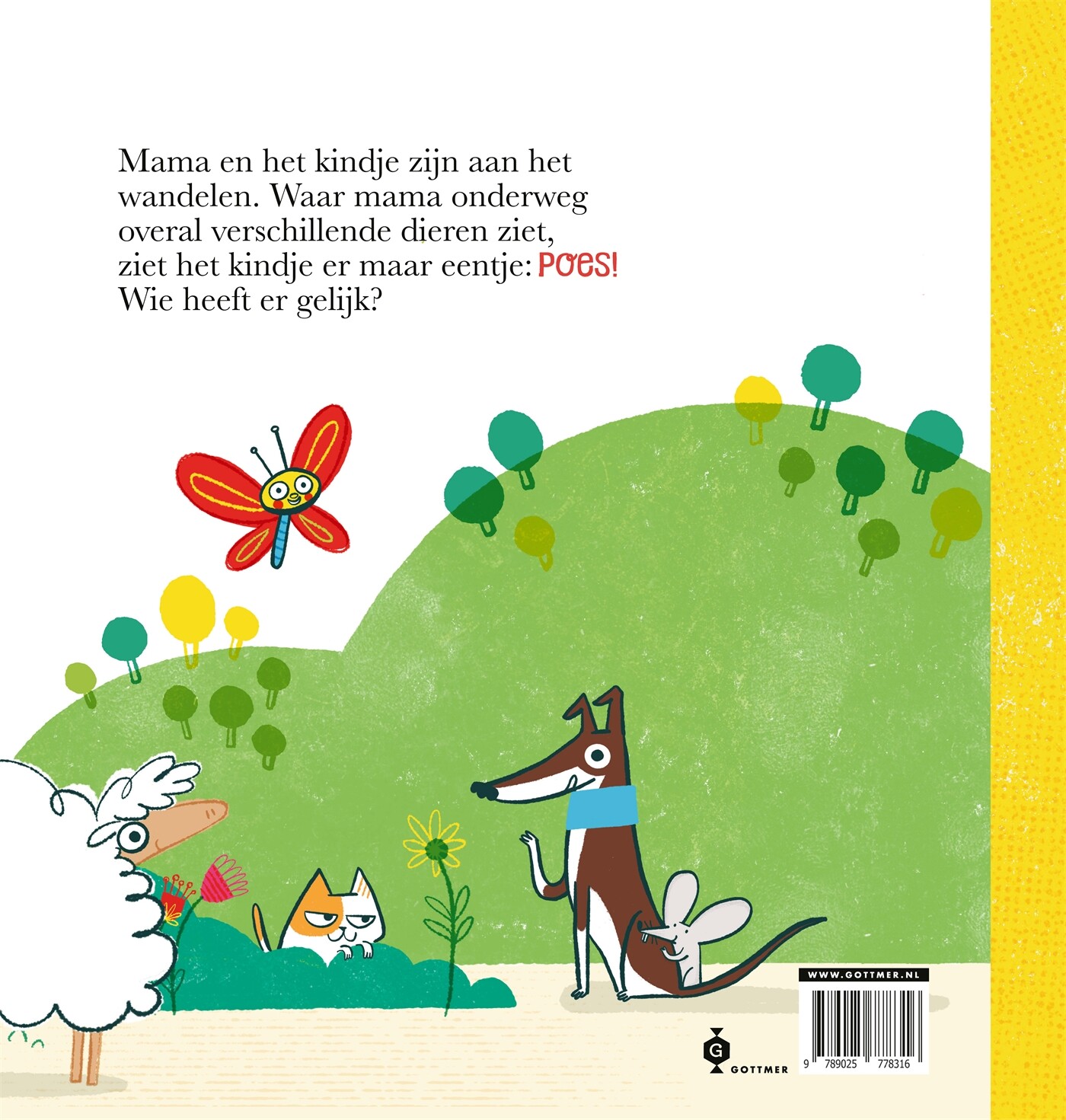 Op een mooie ochtend maken mama en haar kleintje een wandeling. Het kindje wijst en zegt enthousiast: ‘POES!’ Maar mama corrigeert zachtjes. ‘Nee, dat is een kikker.’ Opnieuw roept het kindje: ‘POES!’ En weer legt mama geduldig uit: ‘Ook niet, dat is een hond.’ Mama en haar peuter hebben duidelijk oog voor verschillende dingen om hen heen. Maar attente lezers zullen, naast alle vrolijke dieren die mama benoemt, de poes ontdekken die inderdaad op elke pagina te vinden is.
