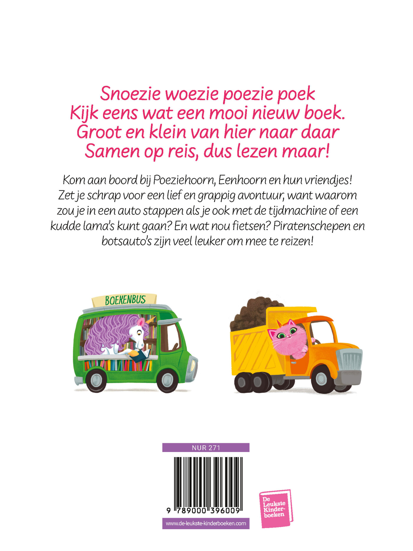 Stap aan boord bij Poeziehoorn, Eenhoorn en hun vriendjes! Zet je schrap voor een lief en grappig avontuur, want waarom zou je in een auto stappen als je ook met de tijdmachine of een horde lama’s kunt gaan? En wat nou fietsen? Piratenschepen en botsauto’s zijn veel leuker om mee te reizen!