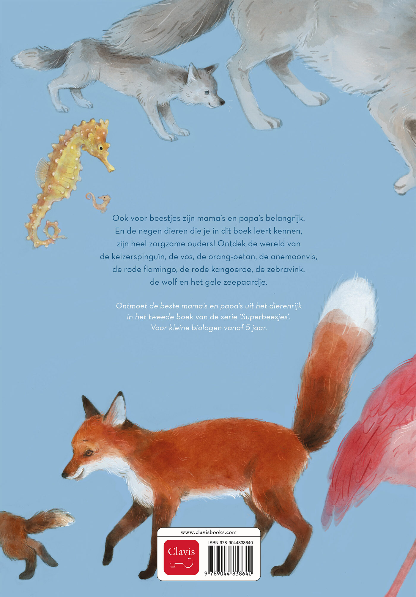 Ook voor beestjes zijn mama’s en papa’s belangrijk. En de negen dieren die je in dit boek leert kennen, zijn heel zorgzame ouders! Ontdek de wereld van de keizerspinguïn, de vos, de orang-oetan, de anemoonvis, de rode flamingo, de rode kangoeroe, de zebravink, de wolf en het gele zeepaardje.