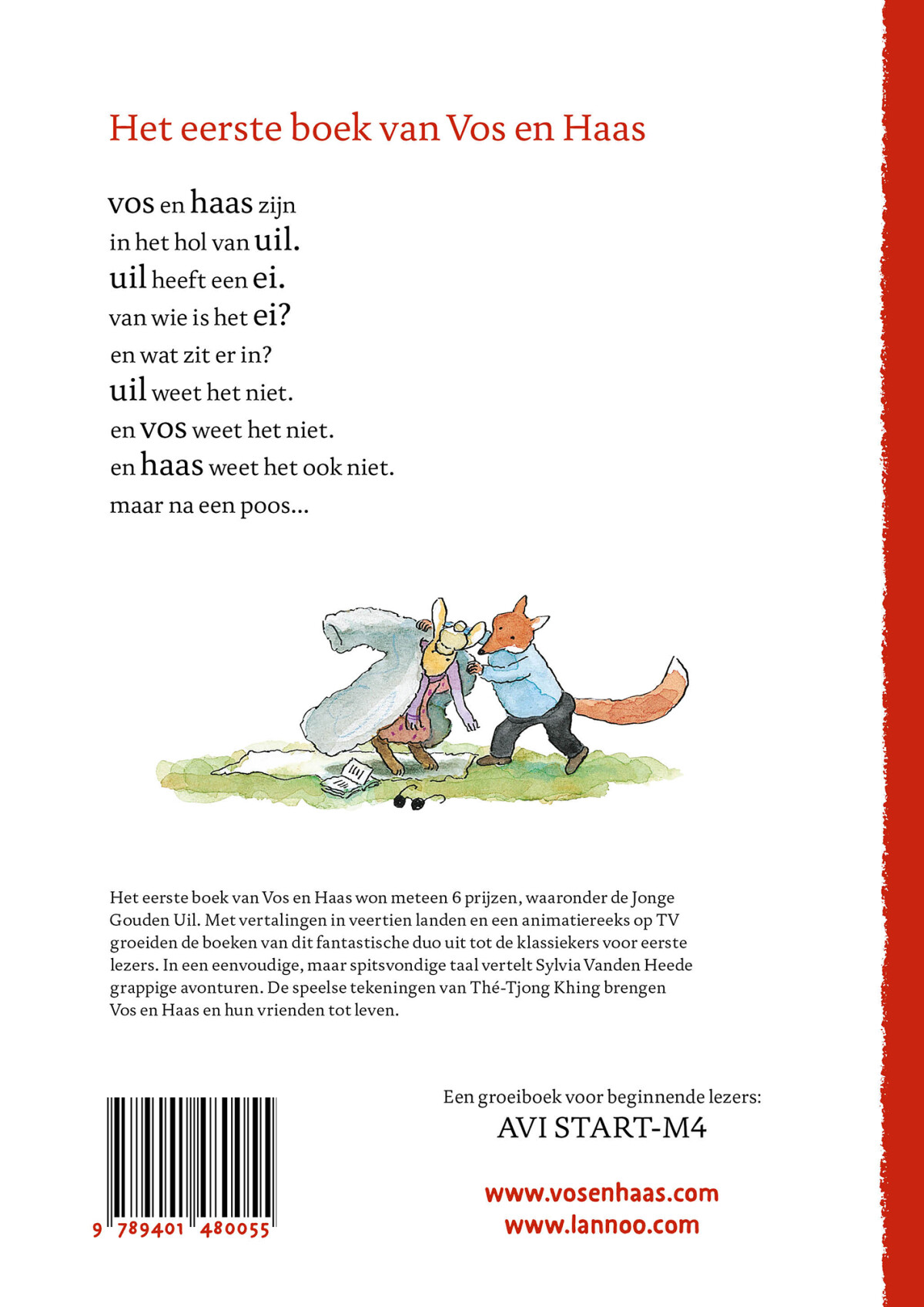 Het eerste boek van Vos en Haas won meteen 6 prijzen, waaronder de Jonge Gouden Uil. Met vertalingen in veertien landen en een animatiereeks op TV groeiden de boeken van dit fantastische duo uit tot de klassiekers voor eerste lezers.