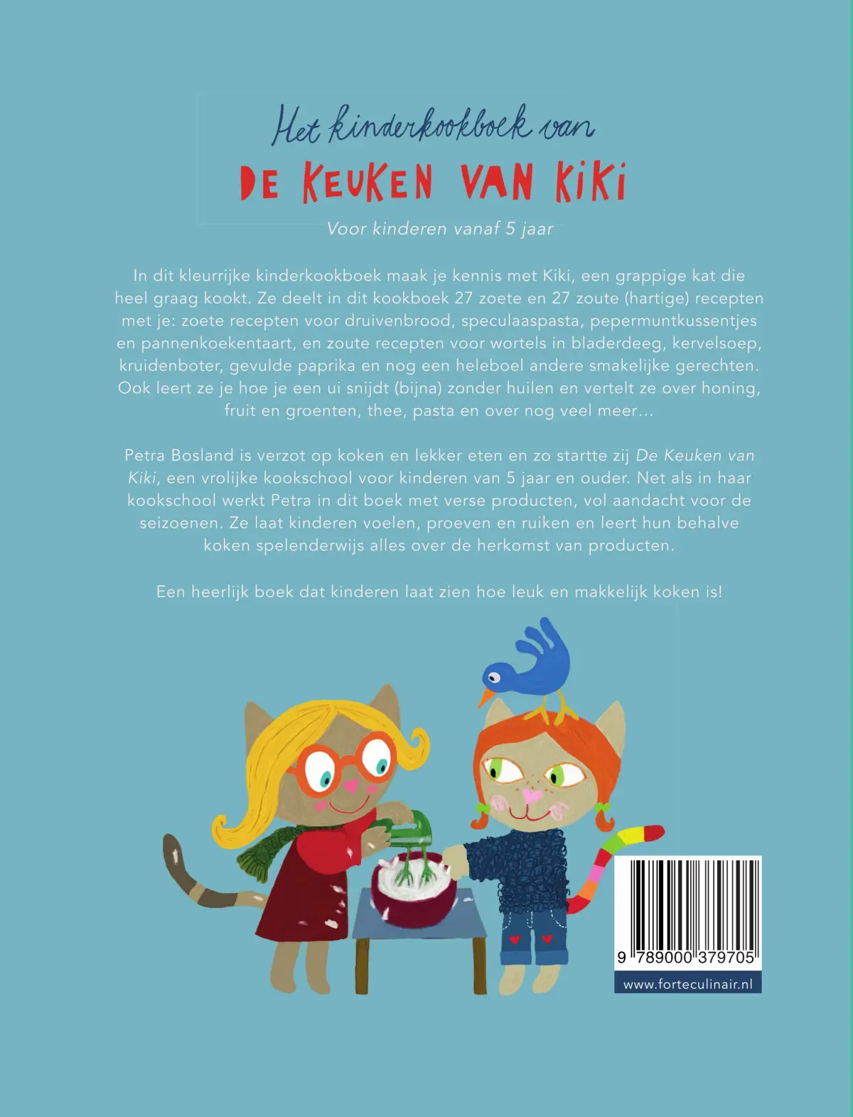 In dit kleurrijke kinderkookboek maak je kennis met Kiki, een vrolijke kat die heel graag kookt. Ze deelt in dit kookboek 27 zoete en 27 hartige (‘zoute’) recepten met je: zoete recepten voor druivenbrood, speculaaspasta, pepermuntkussentjes en pannenkoekentaart, en hartige recepten voor wortels in bladerdeeg, kervelsoep, kruidenboter en gevulde paprika. Ook leert Kiki je hoe je een ui snijdt (bijna) zonder huilen. Ze vertelt over honing, fruit en groenten, thee, pasta en over nog veel meer