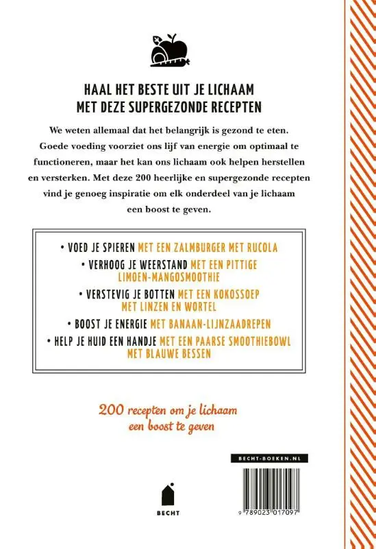 Geef je lichaam en gezondheid een opkikker met de recepten uit ‘Supergezond’! In deze ultieme gezondheidsgids vind je maar liefst 200 recepten die je lichaam een boost kunnen geven. Boost je brein met een voedzame tonijnsalade, verzorg je buik en darmflora met heerlijke kimchi en versterk je botten met een smakelijke kokossoep. Van je huid, weerstand en hart tot je buik, brein en botten: élk aspect van je lichaam komt aan bod. Zo ontdek je snel alle gezondheidsvoordelen die bepaalde voeding met zich meebrengt. Met ‘Supergezond’ geef je jezelf de ultieme gezonde boost.