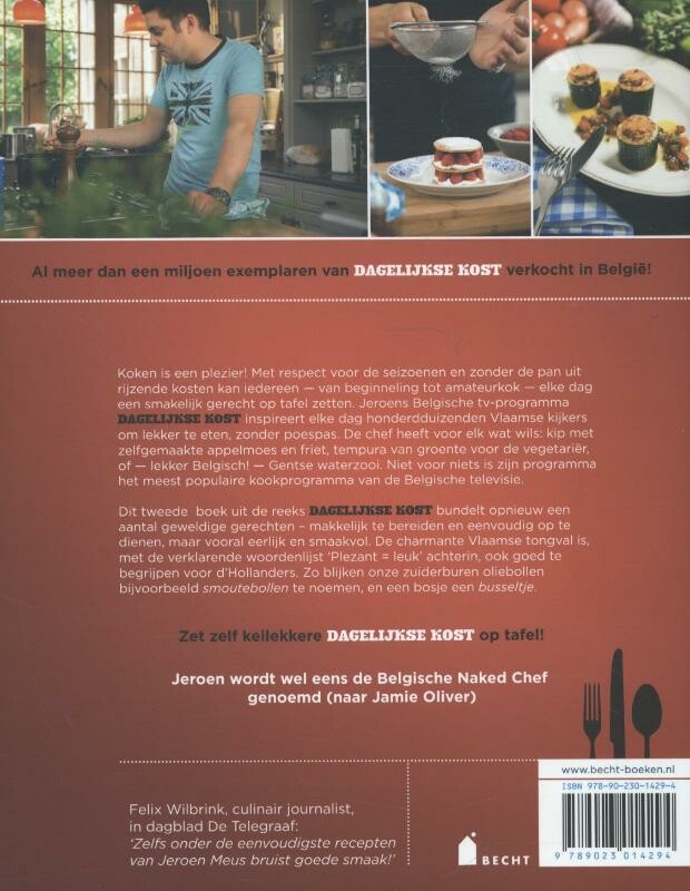 Het tweede boek uit de ‘Dagelijkse kost’-reeks bundelt een aantal geweldige gerechten – makkelijk te bereiden en eenvoudig op te dienen, maar bovenal eerlijk en smaakvol. De charmante Vlaamse tongval vindt men in het hele boek terug. Niet voor niets is Jeroens programma het populairste van de Belgische televisie. En nu maar wachten tot deze Belgische kookheld ook in Nederland op prime time zijn kookkunsten aan ‘den Ollanders’ mag laten zien…