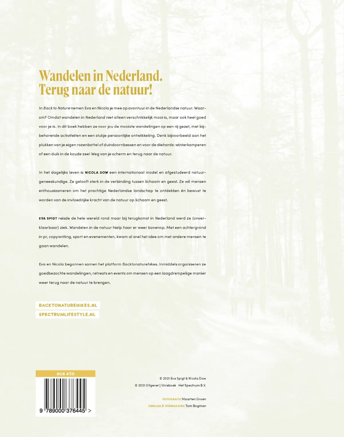In 2019 kreeg Eva Spigt onverklaarbare gezondheidsklachten en liep ze helemaal vast. Om een beetje te ontspannen begon ze samen met haar vriendin en hardcorewandelaar Nicola Dow, lange wandelingen door Nederland te maken. De natuur heeft van kleins af aan een belangrijke rol gespeeld in het leven van Nicola. Urenlang wandelen door bos en duinen is voor haar een manier om te vertragen, te verstillen en zich te laten verwonderen. Eva knapte onwijs op van deze wekelijkse wandelingen en zo ontstond ook het idee om samen het platform Backtonaturehikes te starten.